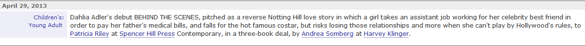 That's right! My amazing friend and CP, Dahlia Adler, just sold her book BEHIND THE SCENES to Spencer Hill Contemporary!